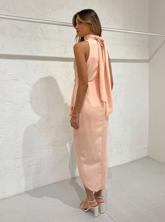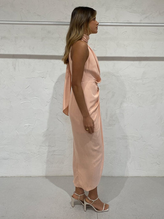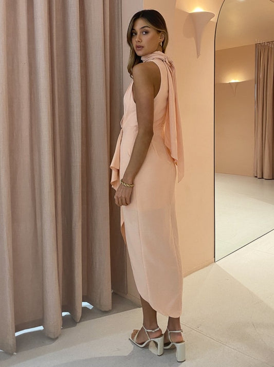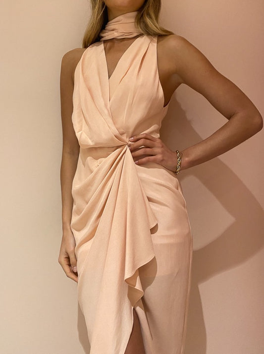 A sleeveless midi length dress, the Daleside designed to grace the femme form complimented with a v-neckline and signature tuck and fold detailing at the waist that creates a romantic asymmetric hemline.