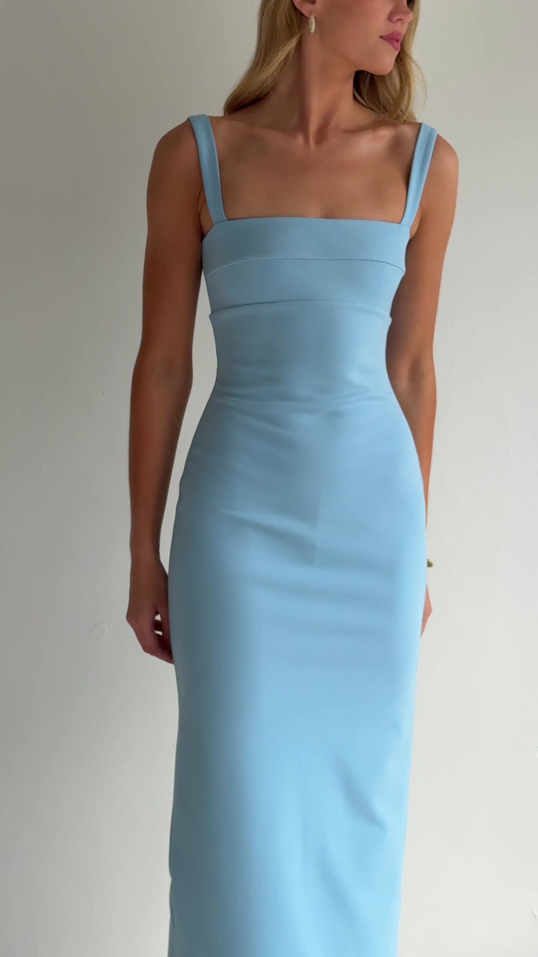 The Ari Midi Dress in Blue is made from a thick stretch crepe. Fully lined with centre back zip, fitted bust panel, shoulder straps and centre back skirt split.