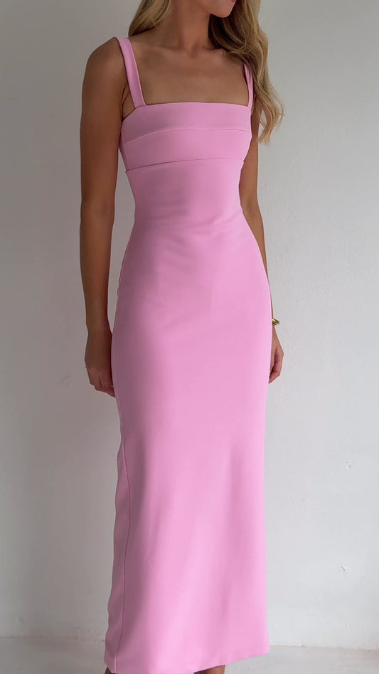 The Ari Midi Dress in Pink is made from a thick stretch crepe. Fully lined with centre back zip, fitted bust panel, shoulder straps and centre back skirt split.