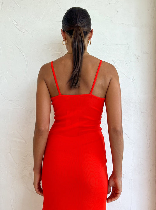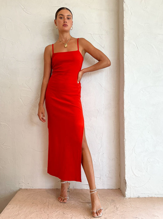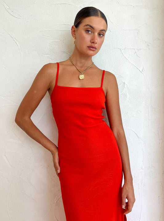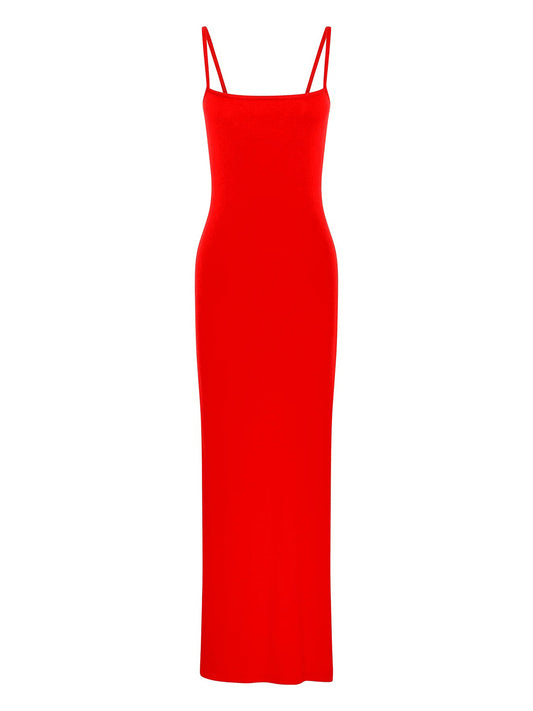 Crafted from a soft yet firm cotton rib with added stretch, the Serena features spaghetti straps that frame the neckline and a split at the side to highlight your footwear of choice.