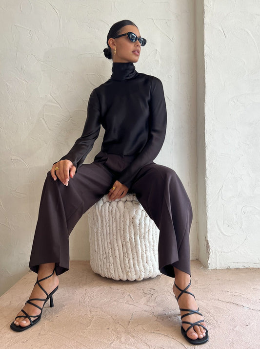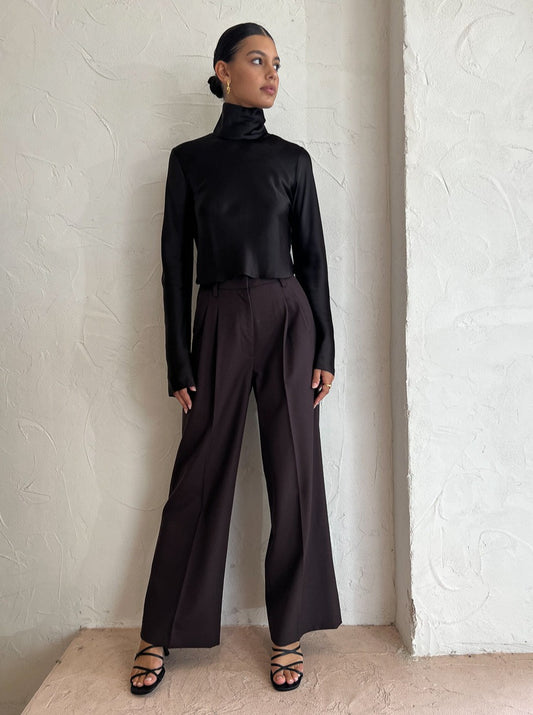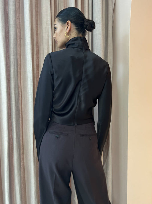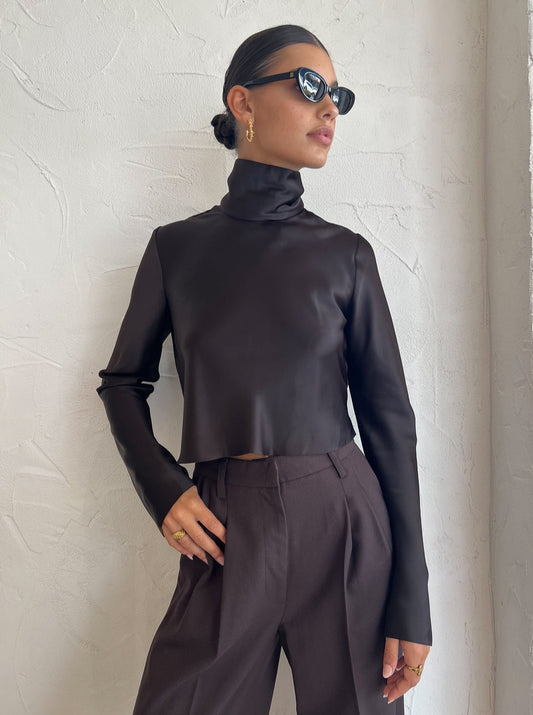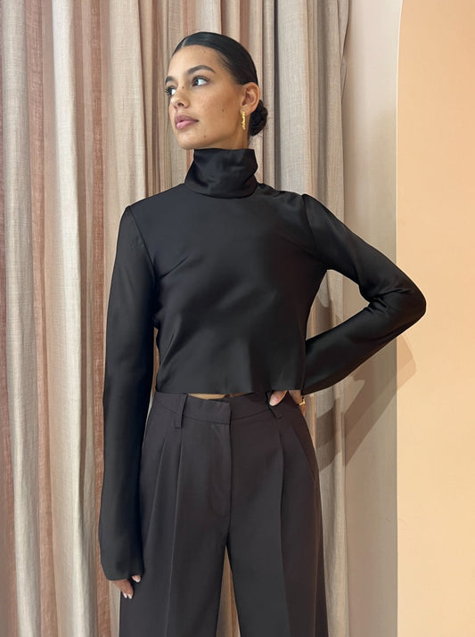 Crafted from sumptuous satin and expertly cut on the bias, this timeless piece features a turtle neck, cropped hemline, and long sleeves.