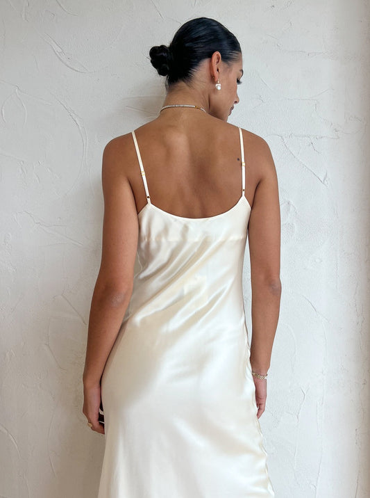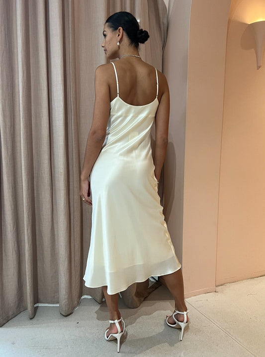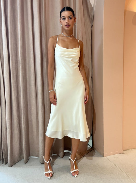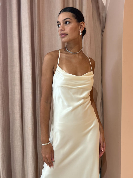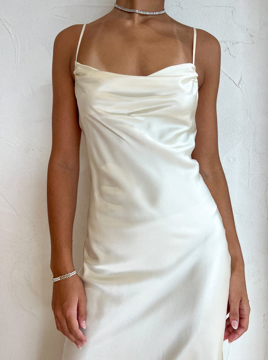 Crafted from pure silk, this dress is designed for bridal or special occasions, boasting a cowl neckline, adjustable spaghetti straps and a luxurious, lined silhouette that envelops and enhances your figure.