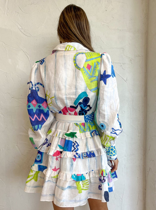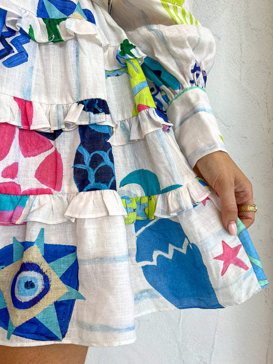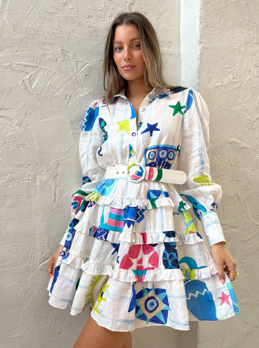 Crafted from lightweight Ramie fabric and designed with an artist collaboration print, this dress features bustier detailing, ladder trims and self-fabric straps.