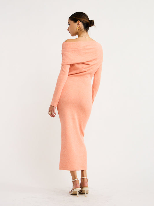 Crafted in a medium weight knitted fabrication with natural stretch. this feminine midi is tailored with a sculpting fit and complimented by an off-the-shoulder neckline and draped neckline.