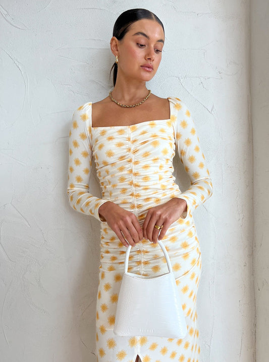 Carefully crafted from a stretch jersey fabrication, this dress features a square neckline, long sleeves and centre-ruched detailing.