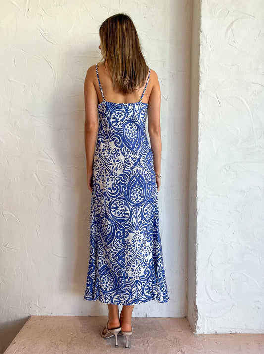 Brighten up any Coco occasion with the Shona Joy Pombeline Bias Slip Midi Dress in Ivory / Deep Blue.
