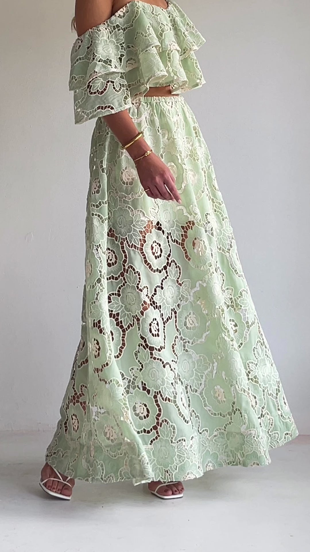 The Sibella Maxi Skirt in Mint Lace from By Nicola is made from a delicate embroidered lace with an elasticised waist and comes with a separate silky touch slip skirt.
