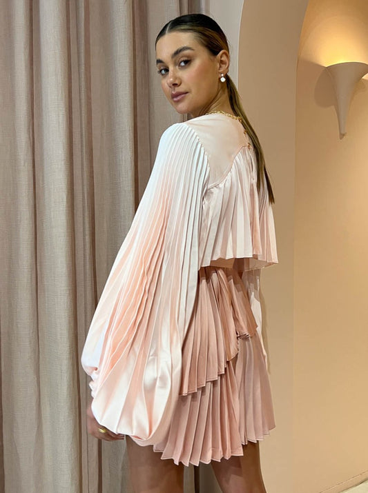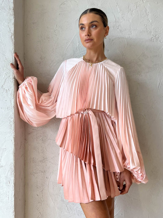 Delicately crafted from a silken to touch pleated fabrication in Gradient Pink hue. This playful mini dress is cut with a round neckline, exaggerated long blouson sleeves that taper at the cuffs and asymmetric tiers throughout.