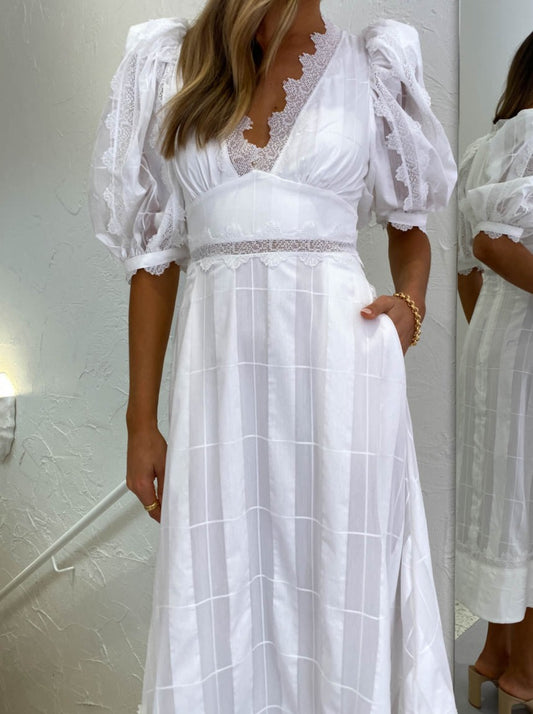 Crafted from a Cotton blend fabrication, this midi dress embraces the femme form with the puff sleeves, plunging V-neckline and banded empire waist which falls into an elegant A-line midi hemline.