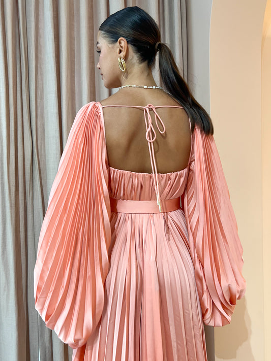 Crafted from a signature pleated satin fabrication, this midi dress features a sweetheart neckline, exaggerated sleeves and asymmetrical hem.
