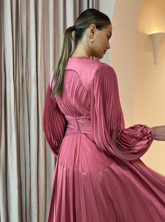 Inspired by coveted silhouettes, this silky to touch pleated maxi is a statement like no other. Cut with a plunging V neckline, it features long blouson sleeves and contrast detail at the shoulders and back neck.
