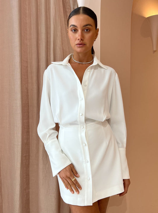Elevate your special occasions with the Margot Mini Shirt Dress in Ivory from By Johnny.