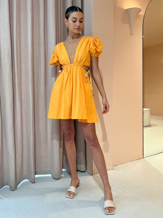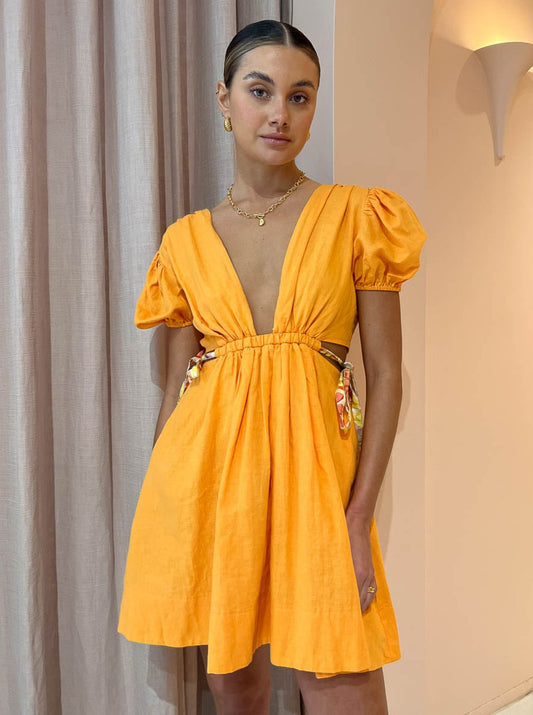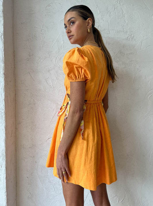 Crafted from a breathable Linen Cotton blend in bright Morange. This sweet mini dress with puff sleeves tapers through the bodice and features a plunging V neckline and self fabric workable ties at the waist in a contrast citrus print.