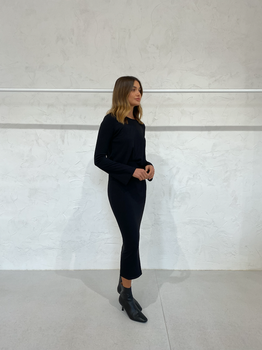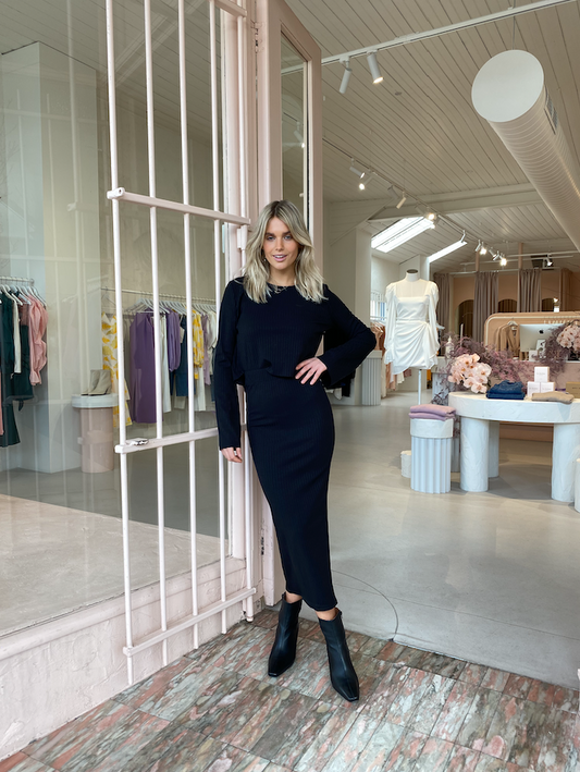 The By Nicola Celestial skirt in Black is a trans seasonal wardrobe essential. This exclusive, ribbed midi skirt features an elasticated waistband, fitted body with subtle side split.