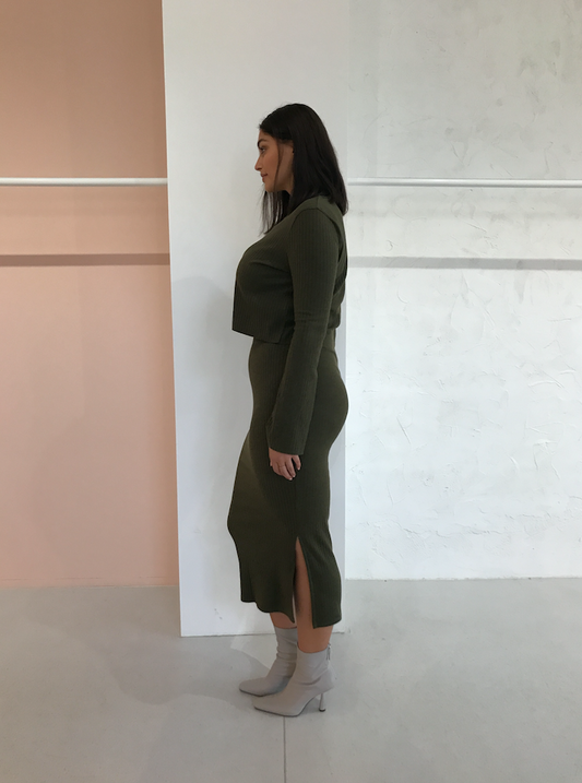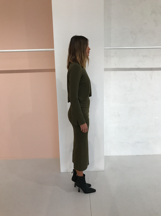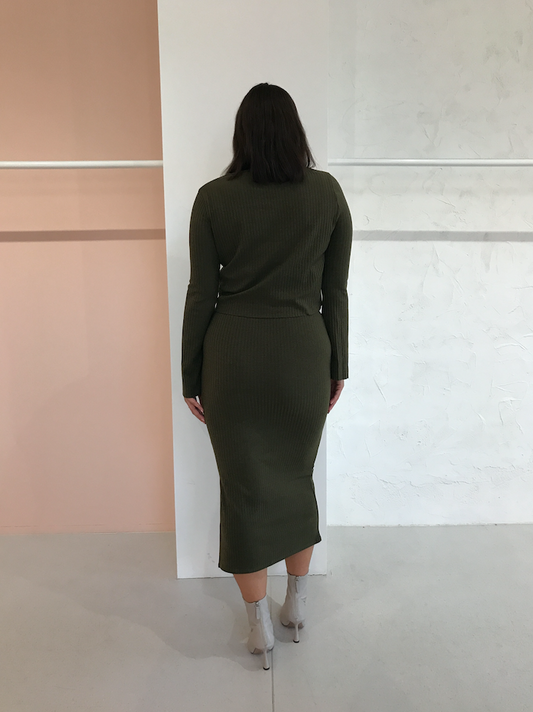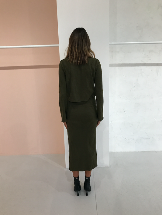 The By Nicola Celestial skirt in Khaki is a Winter wardrobe essential. This exclusive, ribbed midi skirt features an elasticated waistband, fitted body with subtle side split.