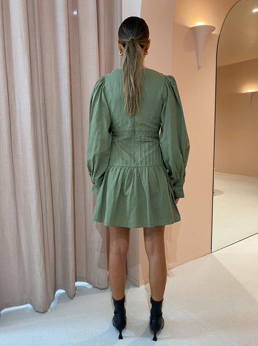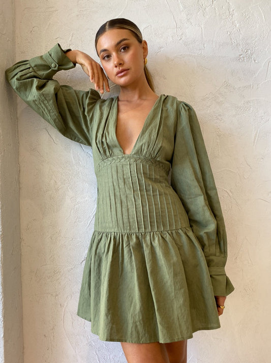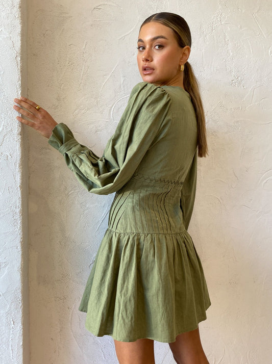 Crafted from a Linen Cotton blend, this mini dress features billow sleeves detailed with a wide sleeve cuff and adjustable button tab. Its plunging V neckline is complimented with gathers before falling into a fitted waist with a plait and vertical fold stitch detail.