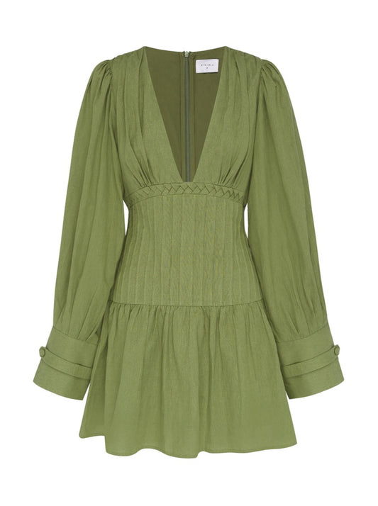 By Nicola Cher V Neck Stitch Waist Mini Dress in Olive
