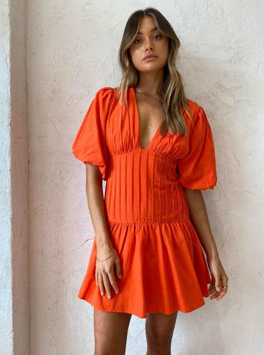 Designed with the Coco girl in mind, this charming mini dress is crafted from a non-stretchy breathable Textured Cotton Fabrication in ravishing Cherry hue. Fitted across the bust and vertical fold stitch detailed waist, it features a deep v plunging neckline and billow bubble sleeves with elasticated sleeve openings.