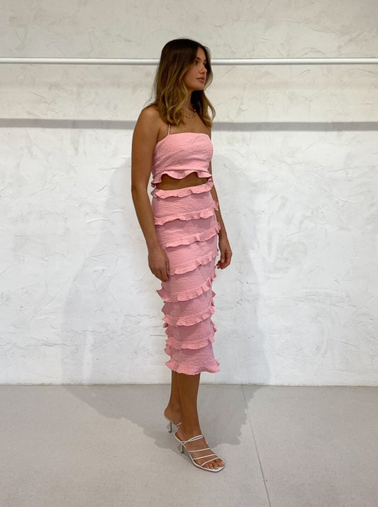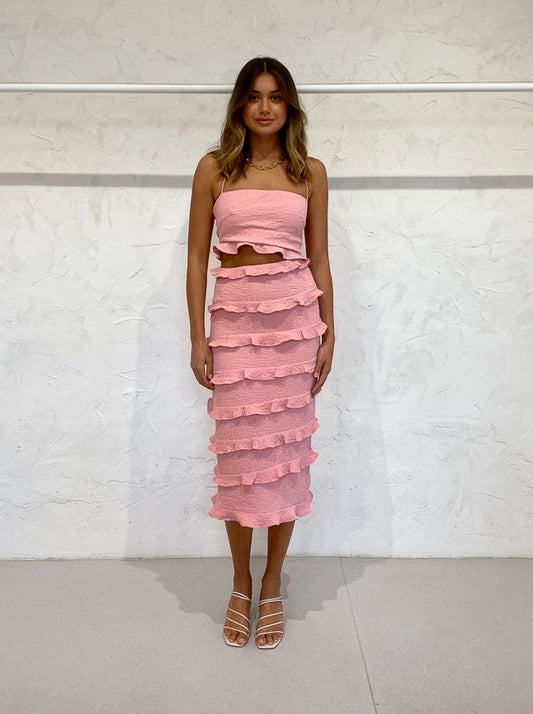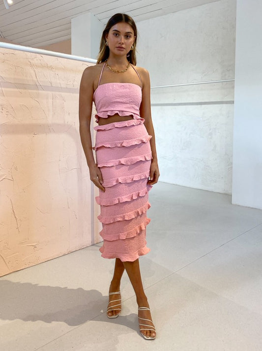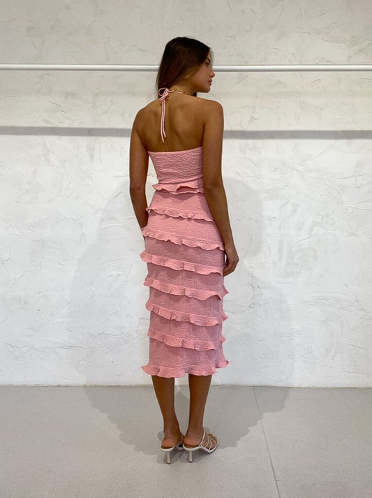 The By Nicola Halo Midi Dress in Melon is the perfect option for all your day time and evening festivies.