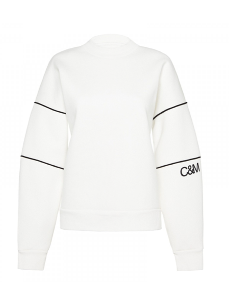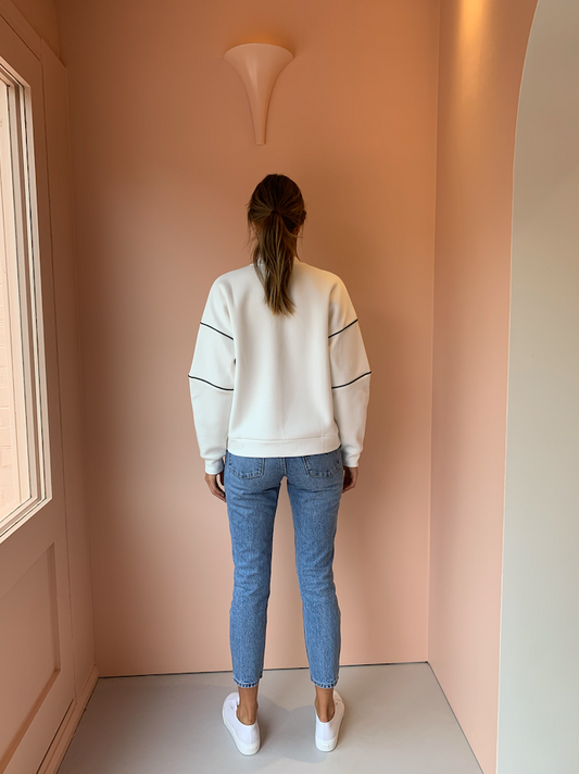 The Sylvie Crew in Soft White by C&M CAMILLA AND MARC is a bonded fleece crew neck sweater with contrast logo and piping detail. Pair with black track pants and leather slides for an edited relaxed look.