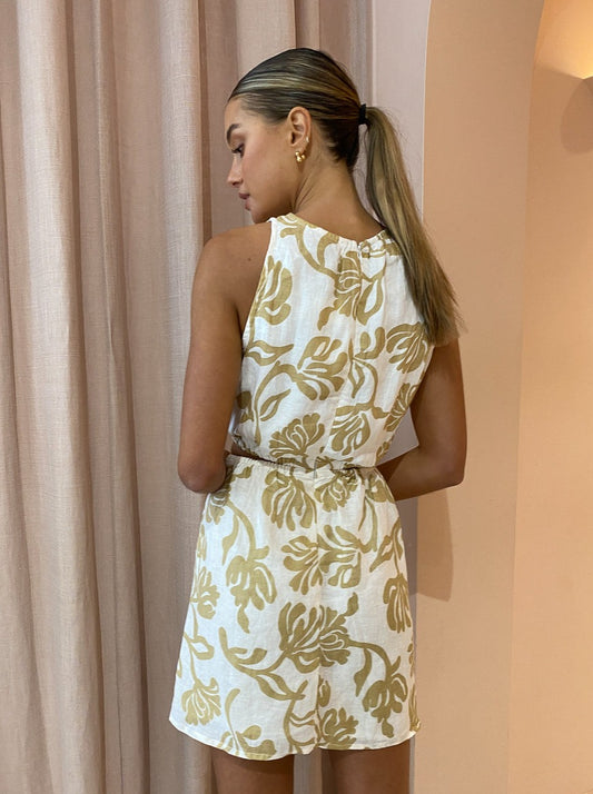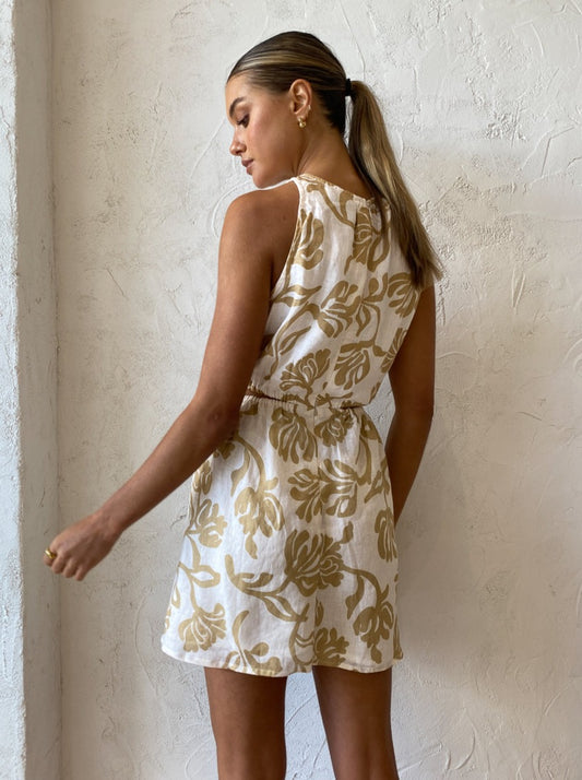 Enjoy sunshine in the Di Tusa Mini Dress in Ensola Print Oat by Faithfull the Brand.