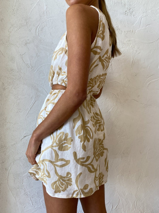 Crafted from a Linen fabrication, this mini dress features waist cut outs which lead to the back and is elasticated at the high neckline and waist.