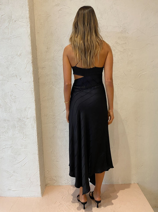 Synonymous with One Fell Swoops drapery, this Midi is thoughtfully crafted from a luxurious black fabrication with a slight texture. Featuring a draped neckline crafted with two cami straps that fall in a cross body shape it transcends into a fluid asymmetric midi skirt.