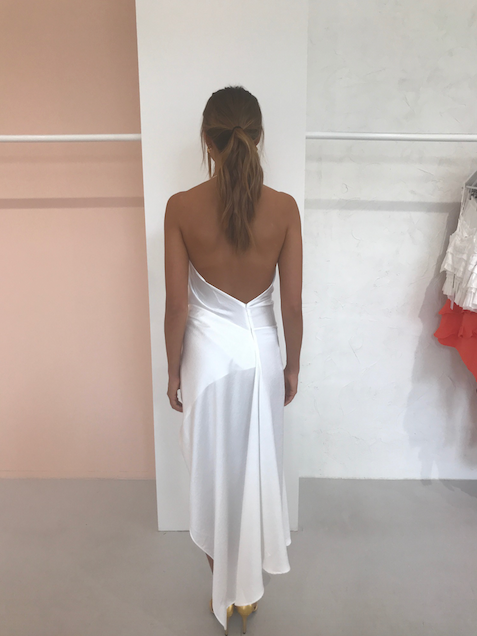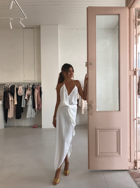 The One Fell Swoop Surreal dress in White in White is a minimalistic silhouette with narrow shoulder straps and a deep V-neck, elevated with signature drapes to define the waist.