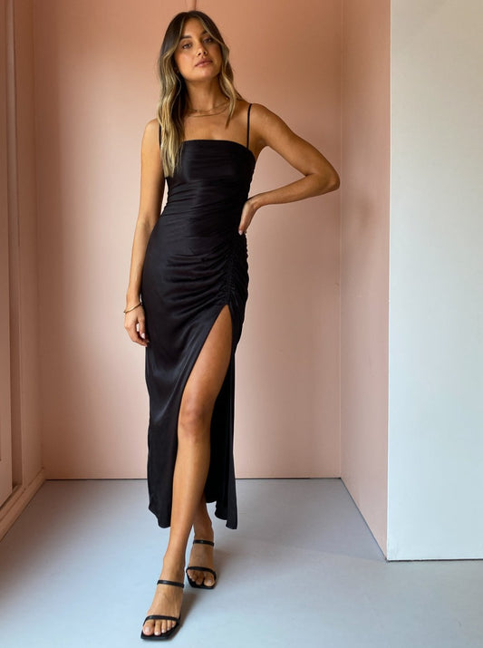 The Thalia Bias Ruched Midi Dress in Black by Shona Joy is a timeless and elegant midi moment for your formal soirees.