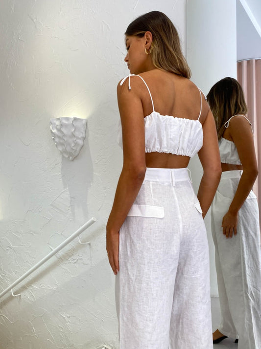 Crafted from a Linen fabrication, these tailored pants sit high on the waist and straight through the legs and feature belt loops, side seam pockets and a back pocket flap design.