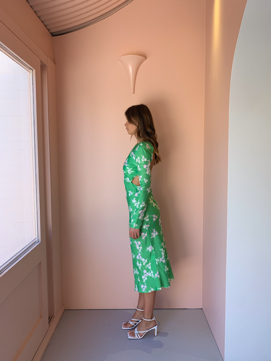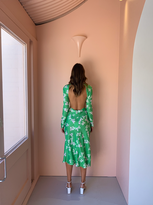 The Rolling Fields Bias Maxi is a fresh and upbeat take on a classic Third Form piece. This exclusive Third Form x Coco and Lola maxi features, a bright Rolling Fields print on premium Cupro, this elegant bias cut piece with long sleeves is perfectly balanced by the open back with delicate neck tie, perfectly balancing chic refinement and a cool girl edge.