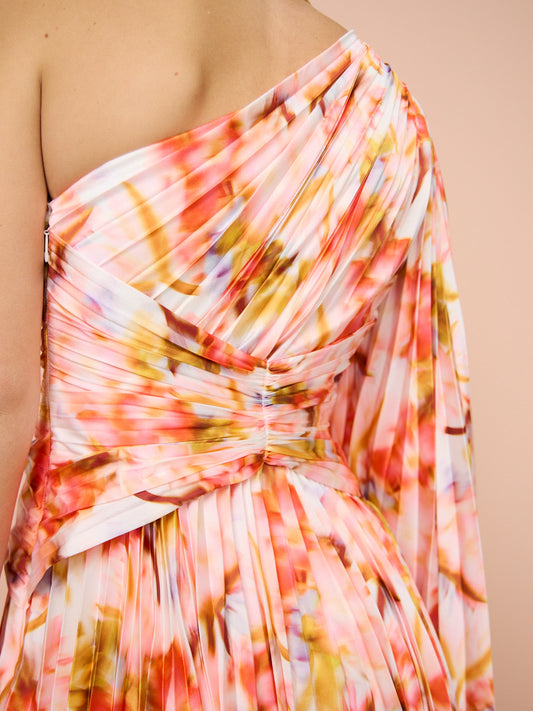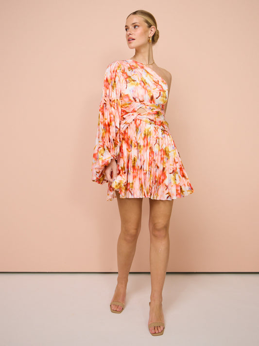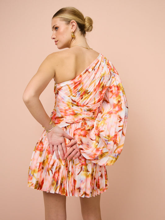 This mini dress features quintessential pleating, a twist detail at waist, and an asymmetrical neckline with a single, statement-making full-length sleeve.