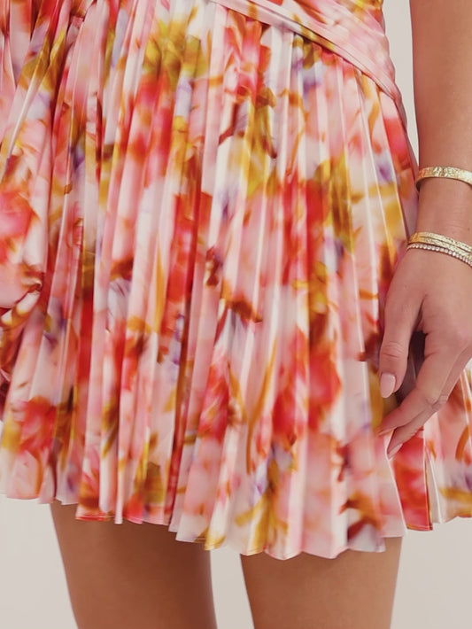With the soft volume through the skirt and a beautiful soft spring floral pattern, this mini dress is ideal for birthday celebrations, cocktail hour, and wedding guest styling.