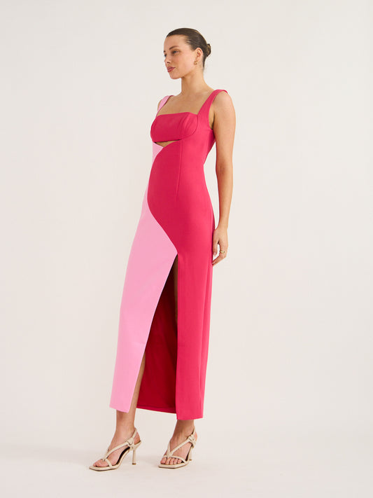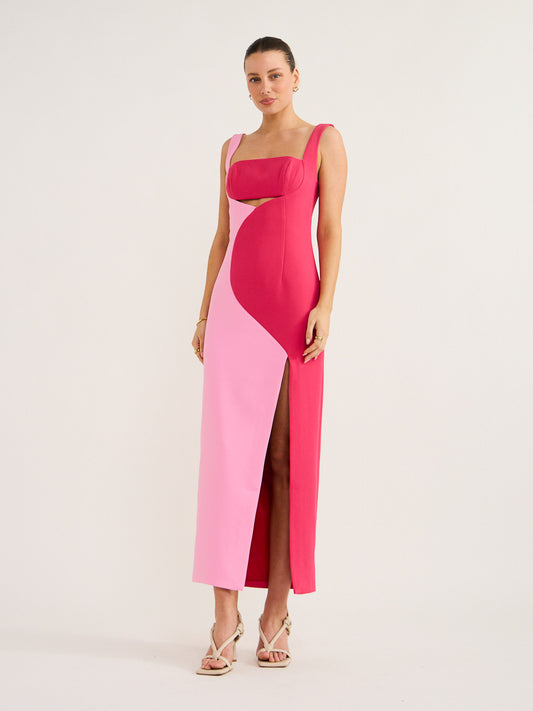 Turn heads at any special occasion in the Caterina Two-Tone Curve Midi Dress in Pink Multi from By Johnny.