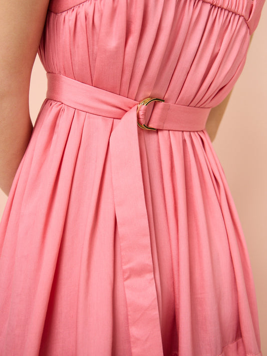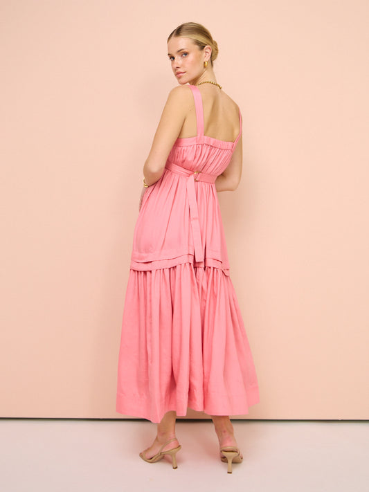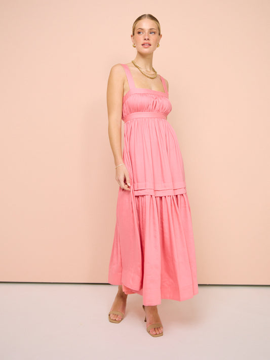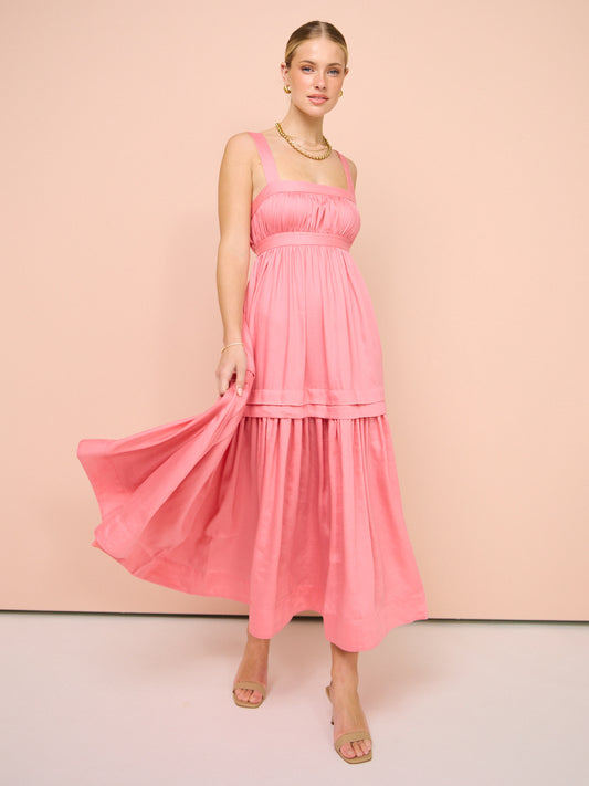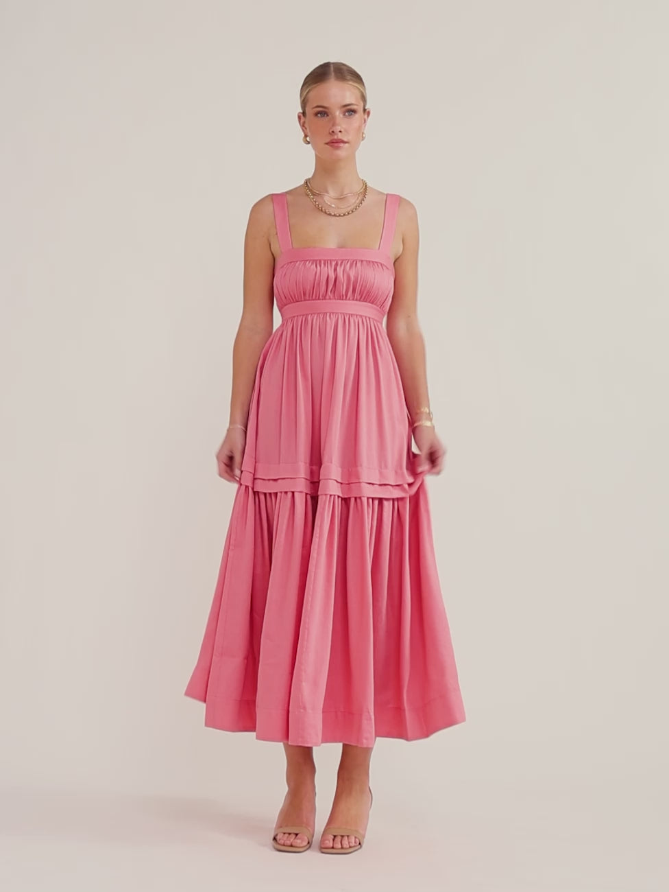 This midi dress features a square neckline, delicate gathers across the bust and soft volume through the skirt to create a quintessential silhouette.
