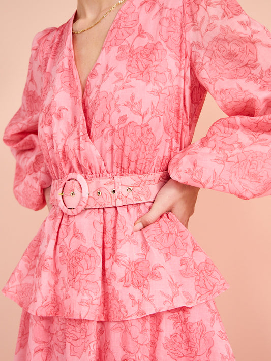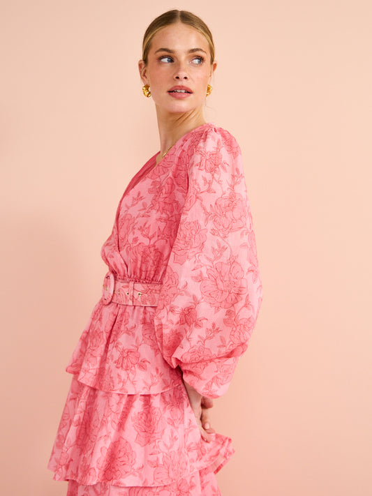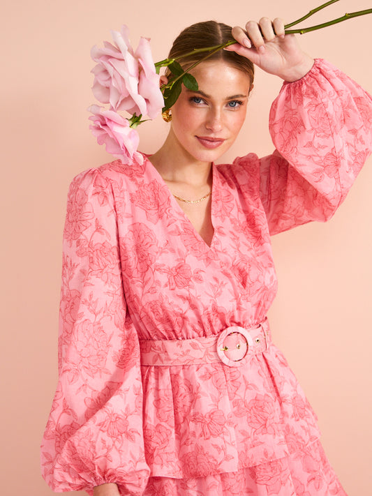 Crafted from a luxuriously light cotton fabrication, this gown features voluminous sleeves, a voluminous ruffled skirt, self covered buckle belt, and an invisible zip closure for a fit that drapes elegantly.
