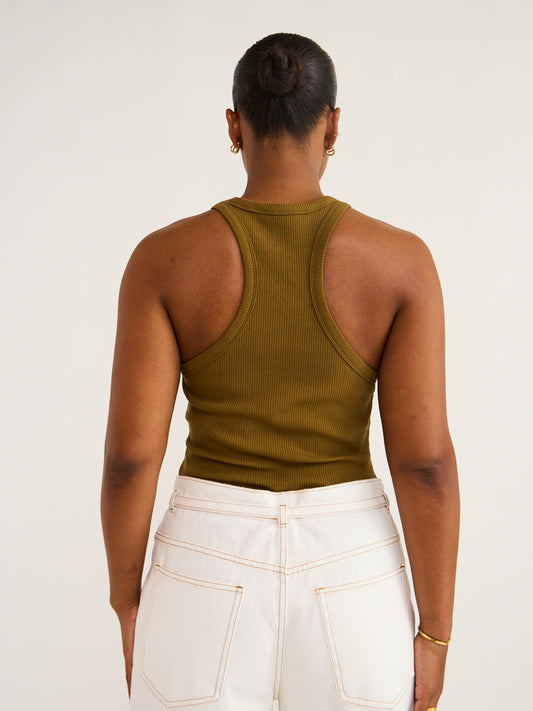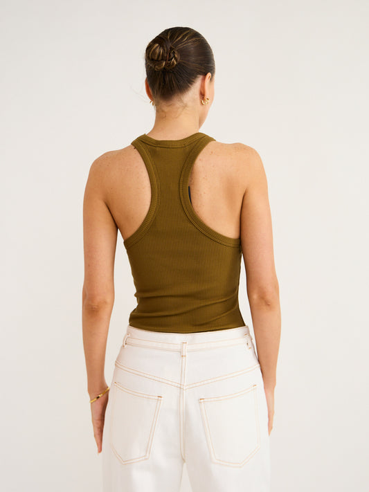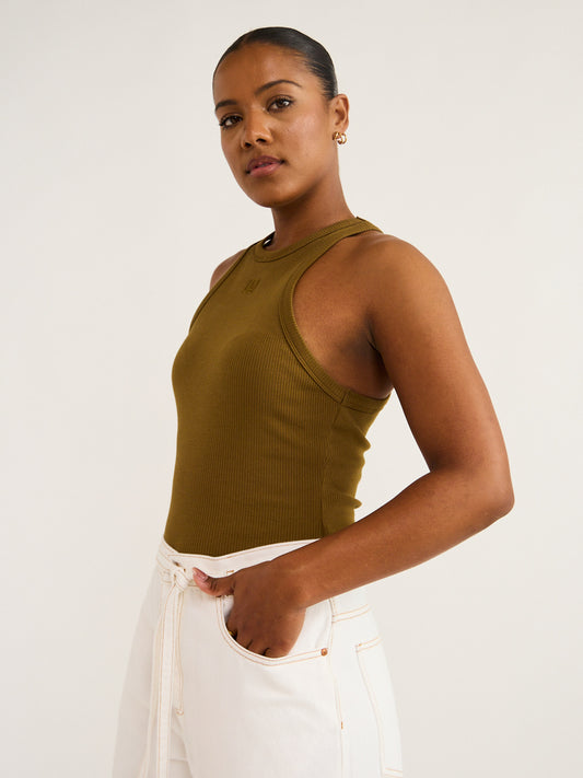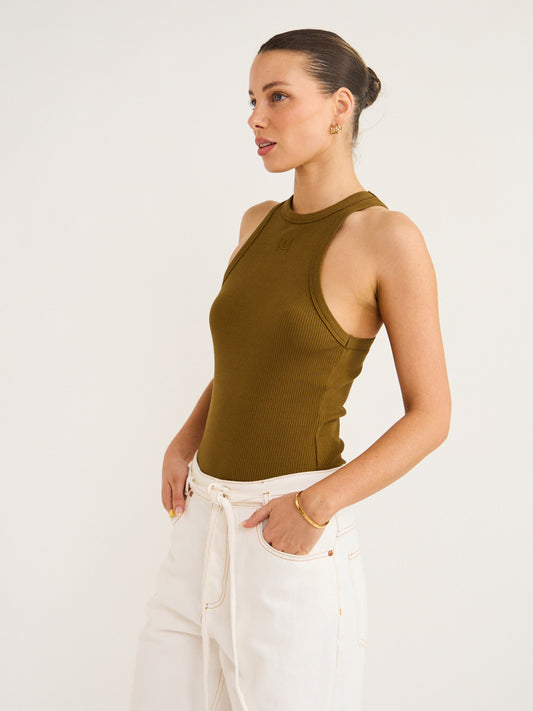 Featuring a racerback cut, wide rib bind at neck, and monogram embroidery, this top fits snug against the body for a contoured look.
