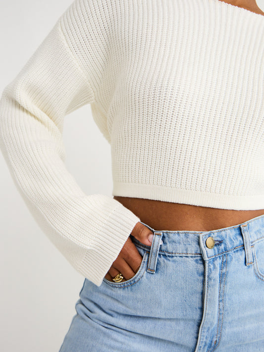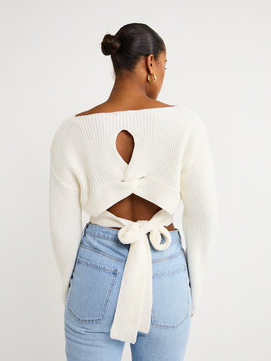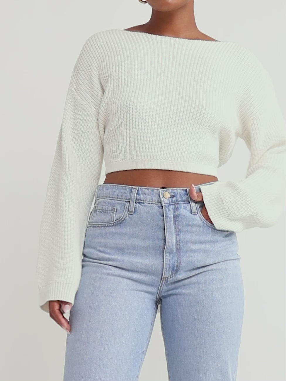 Crafted from a soft cotton blend, this stylish knit features a cropped silhouette and elongated sleeves that expertly frame the open cross-back tie detail.