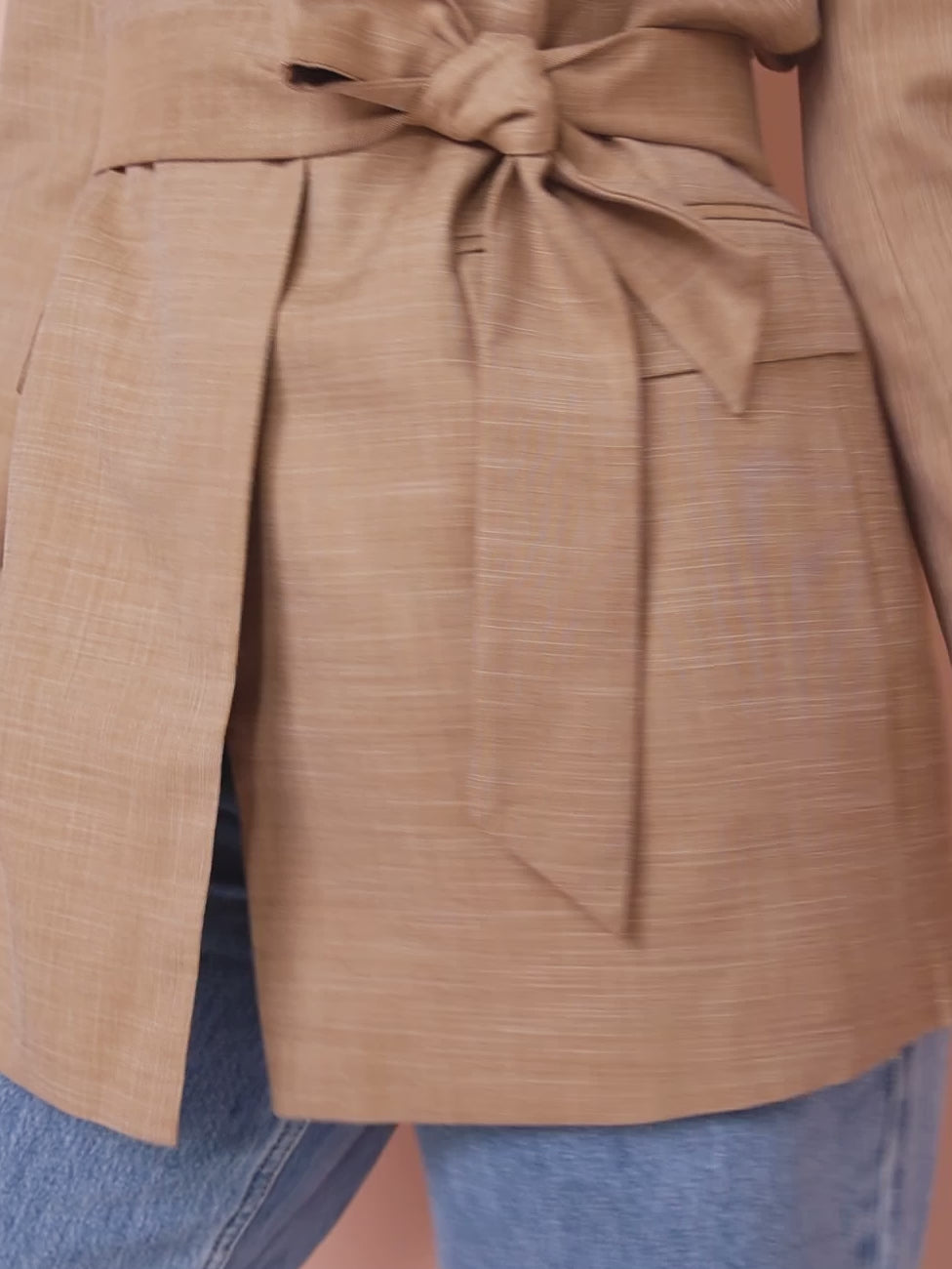 It's crafted with a single button closure, lined interior, and front pockets for modern convenience. Cinch your figure with the self-fabric tie to elevate this staple for elegant evenings.