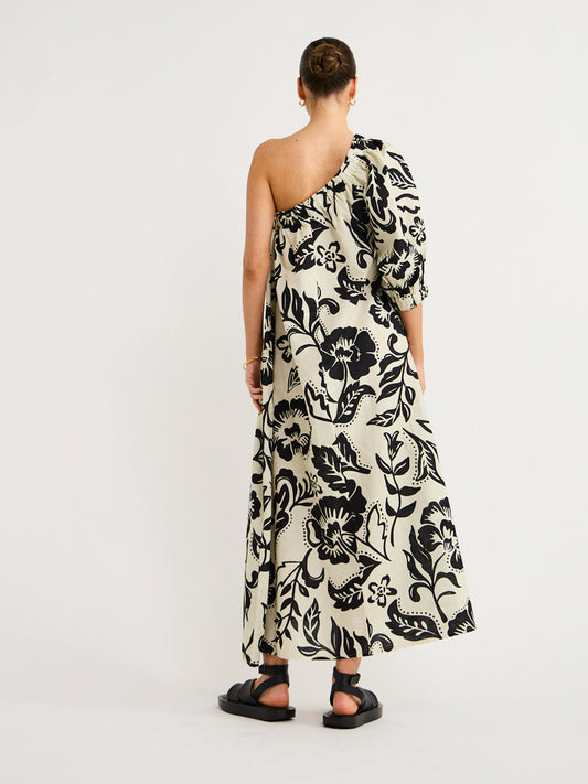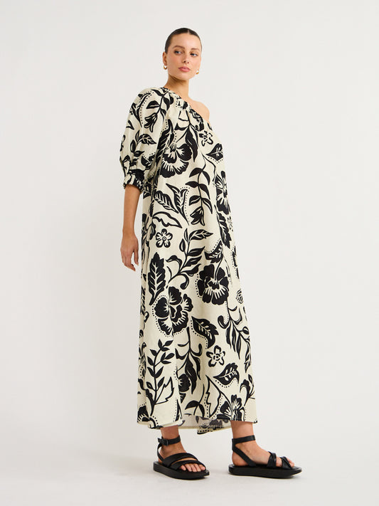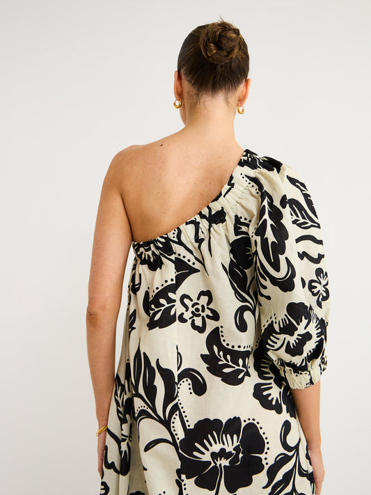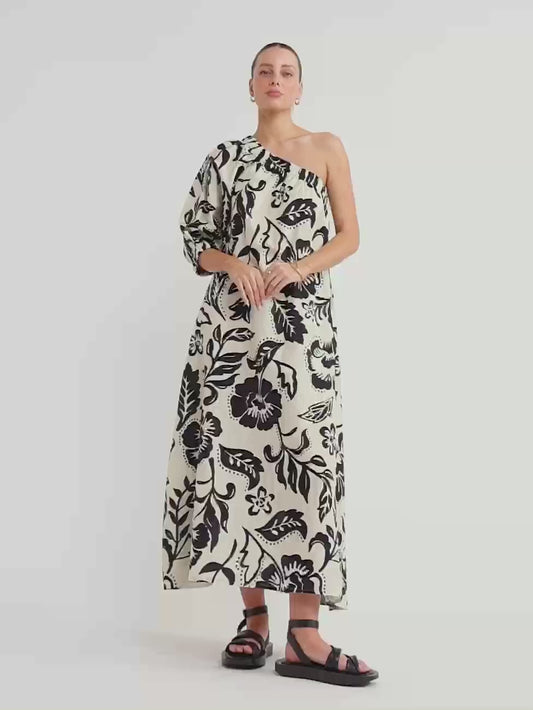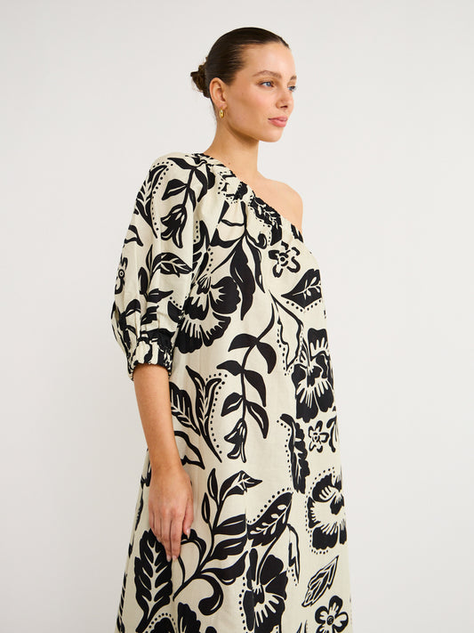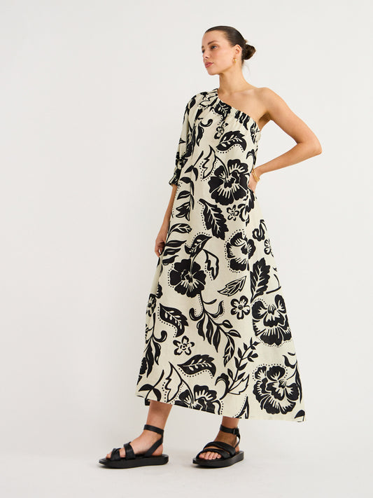 Crafted from a cotton linen blend, this midi dress features an elasticated one shoulder neckline one sleeve silhouette falls to a voluminous A-line silhouette.