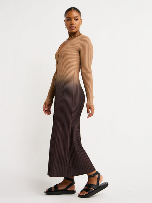 Sophisticated and exclusive, this knit maxi is designed to take you from day to night with its eye-catching ombre dip dye, full length sleeves, V-neckline and front split.