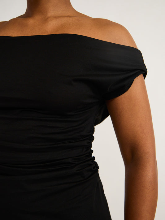 Crafted from a luxurious 100% cotton, this maxi features a feminine off-shoulder design, and ruched details at the sides. Its relaxed fit exudes effortless sophistication.