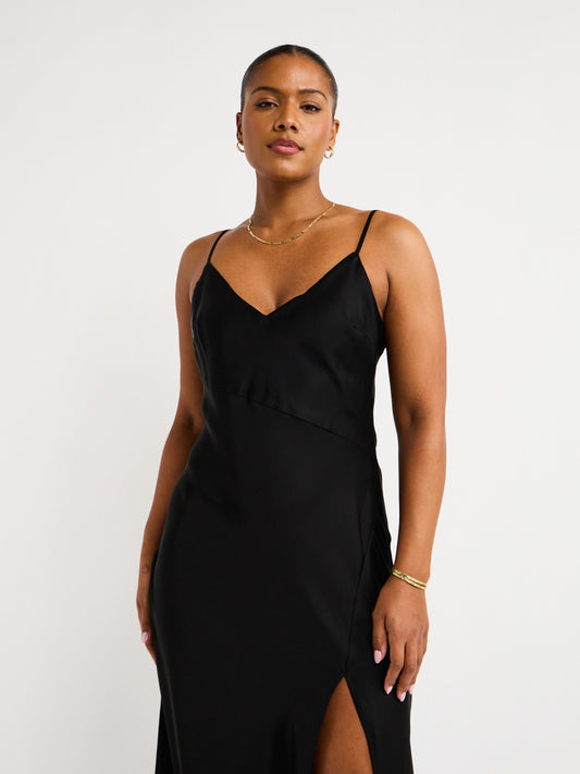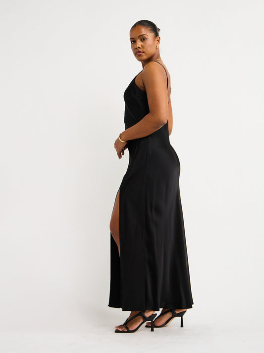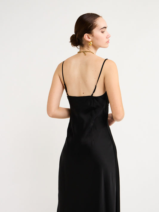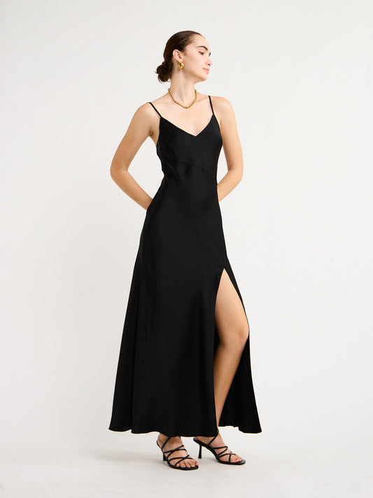 Crafted from a lightweight Japanese cupro and cut on the bias for an elegant drape, this timeless cocktail dress features a soft cowl neckline, adjustable straps, and a daring leg split.