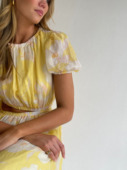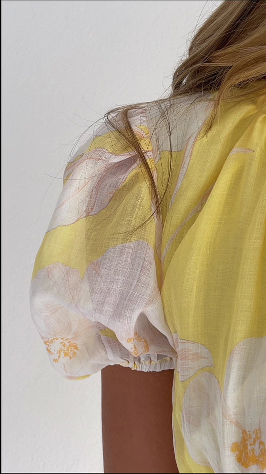 The Amarilla Maxi Dress in Amarilla Flor made from Ramie features a refined high neckline with gathers and a soft puff sleeve.