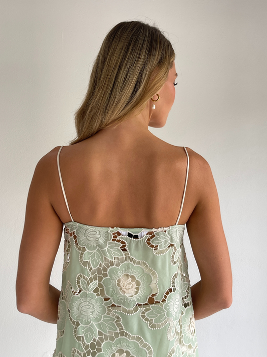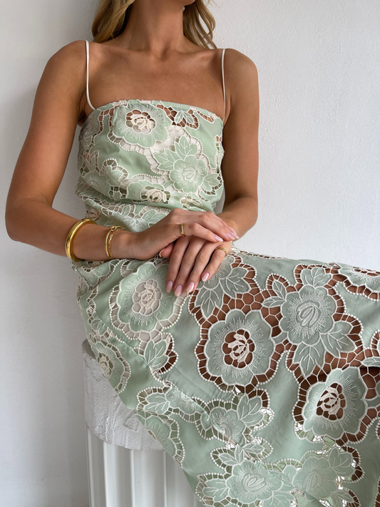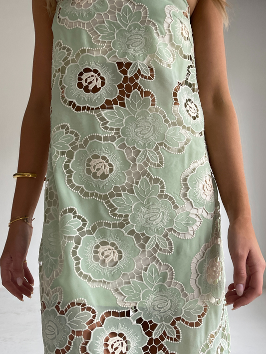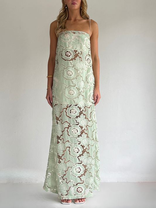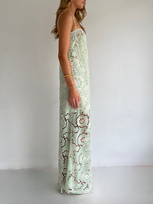 The Tove Maxi Dress from By Nicola is made from a floral lace and comes with a seperate strapless silky mini slip dress.