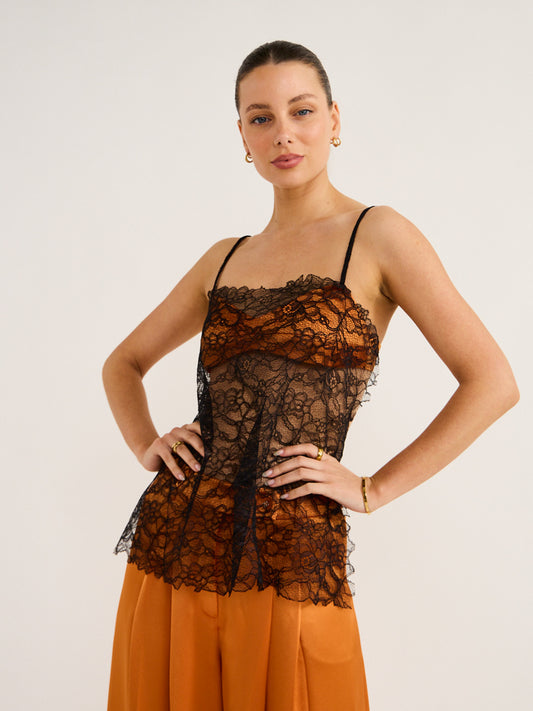 Be the centre of attention in our Zeta Shirt in Kumquat with Black Lace from Anna Quan.