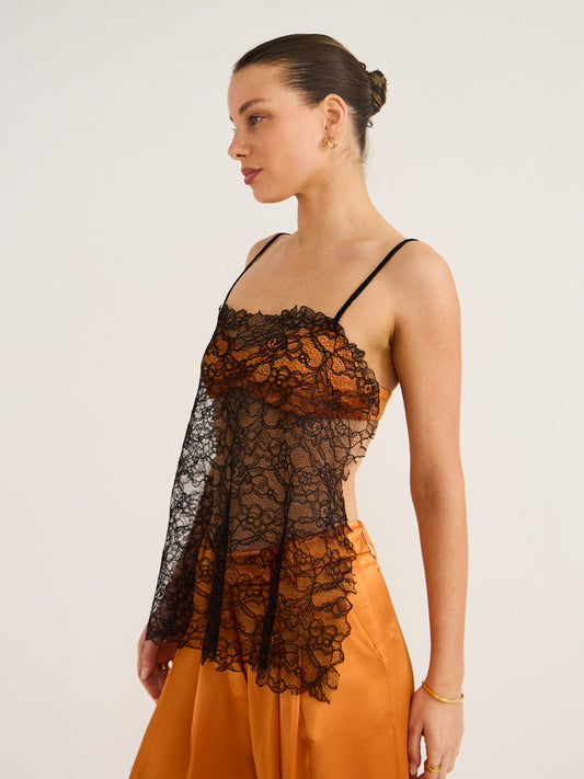 This contrast satin and lace shirt features a bralette bodice paired with a luxurious contrast sheer lace overlay with an exposed open back.