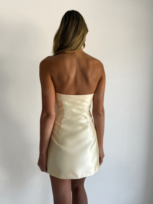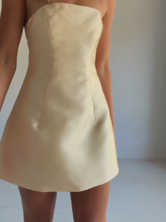 The Arley Celeste Mini Dress in Lemon is made from a structured high sheen Mikado fabric with boning at bodice and an Aline skirt for a flattering shape and fit.
