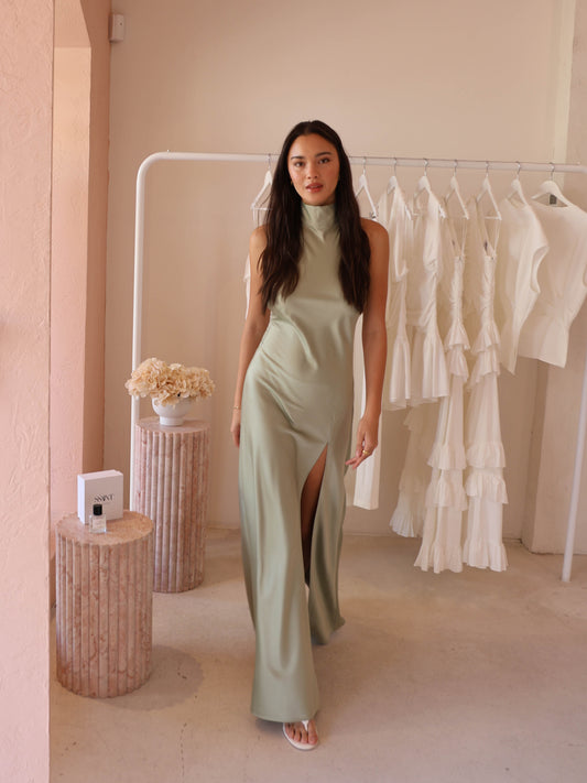 The By Nicola Esme Halter Maxi Dress in Pistachio is a the perfect choice for bridesmaids and formal events. Made from a lightweight fabric, this maxi dress features a high neck halter with a tie detail and a high leg split for ease of movement.