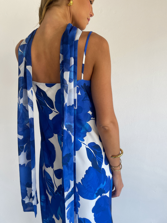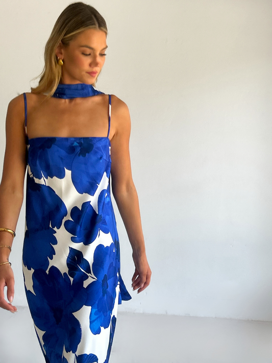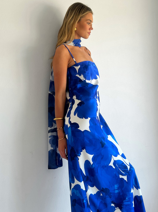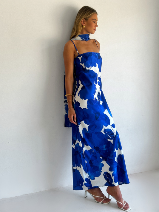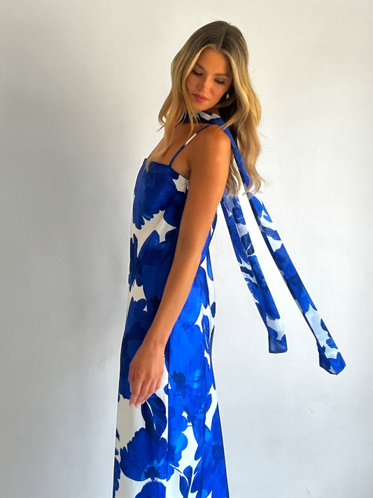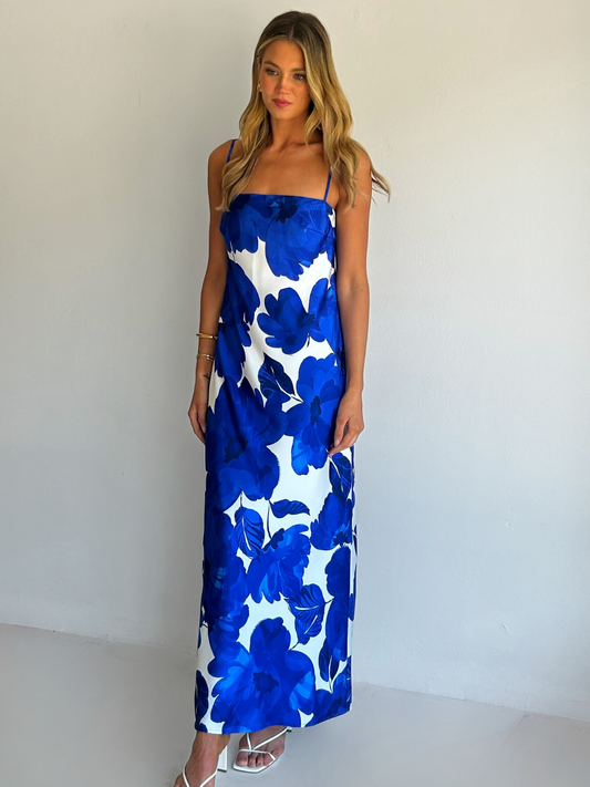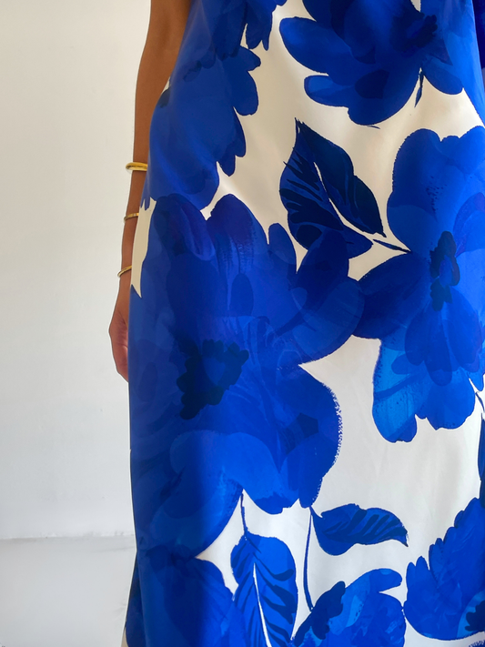 The Maisie Maxi Dress in Blue Petal is a relaxed column style silhouette.  The placement of the print within this style is unique and individual to each piece.